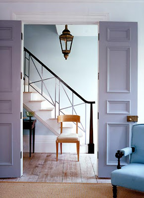 Love the palest silvery blue walls framed by soft lavender painted doors. The ceiling light was also a nice added touch. The entire decor is subtle, yet sophisticated.