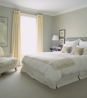 Soft shdes of gray on the headboard, carpet, linens and walls against the creamy yellow of the drapes makes this a serene room. Were big fans of the yellow and gray color combination, especially delicate hues as seen in this bedroom design.